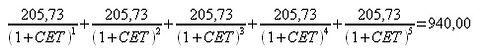 Considerando as prestações pagas a períodos fixos, e utilizando as fórmulas de matemática financeira (por meio de uma planilha de cálculo eletrônica ou calculadora científica), o cálculo do CET ficaria assim: